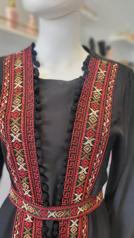 Palestian Black Kaftan with Red Intricate Patterns and Designs