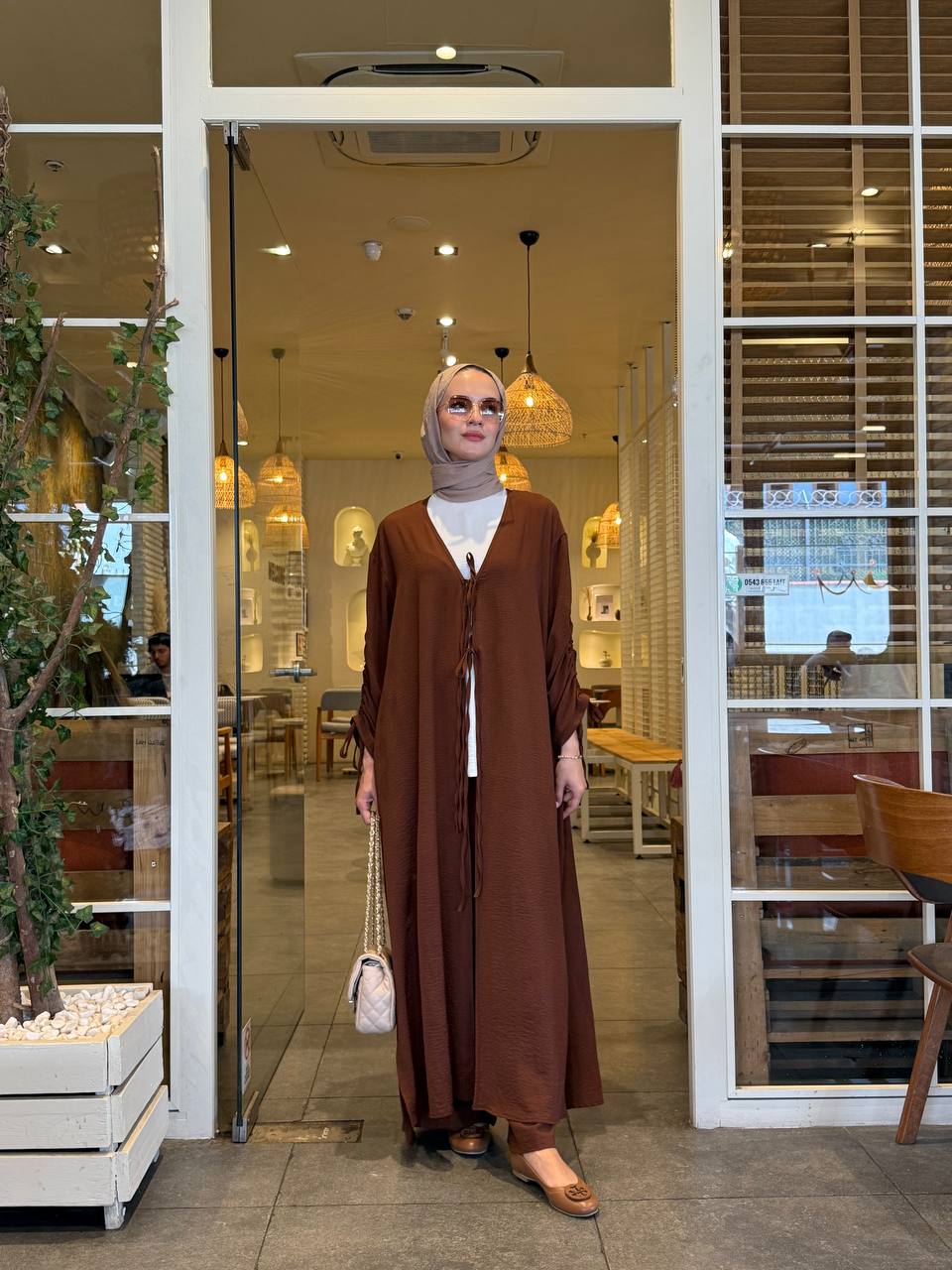 This two-piece abaya set features a flowy open-front tunic with ruched drawstring sleeves and delicate tie details at the chest, paired with wide-leg pants for a modest yet modern silhouette. Crafted from textured Ayrobic fabric, it offers a soft, matte finish with elegant drape and breathable comfort—ideal for both casual and elevated outings.
